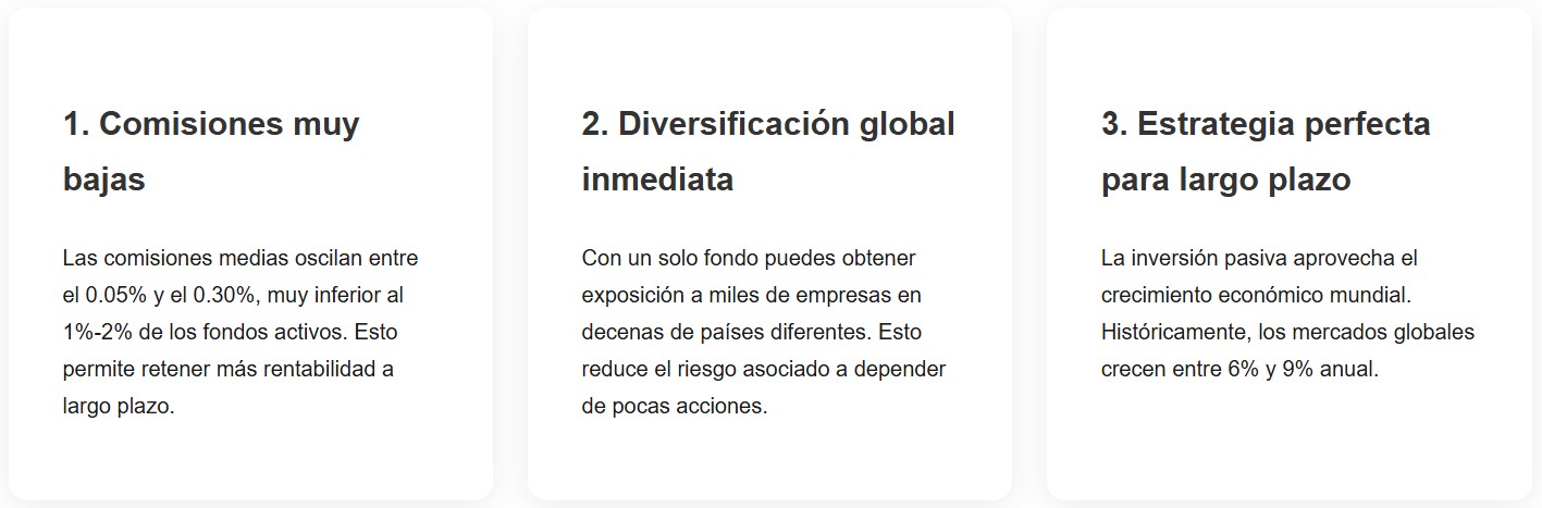 La gestión pasiva de estos fondos permite mantener comisiones extremadamente bajas, lo que se traduce en un mayor rendimiento neto para el inversor. A largo plazo, la diferencia entre pagar un 1,5% de comisión anual y un 0,15% puede suponer decenas de miles de euros.